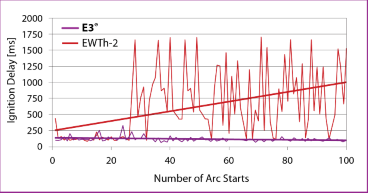 Testing has shown that ignition delay with E3® is actually improved over time while thoriated tungsten starts to deteriorate after only 25 starts.